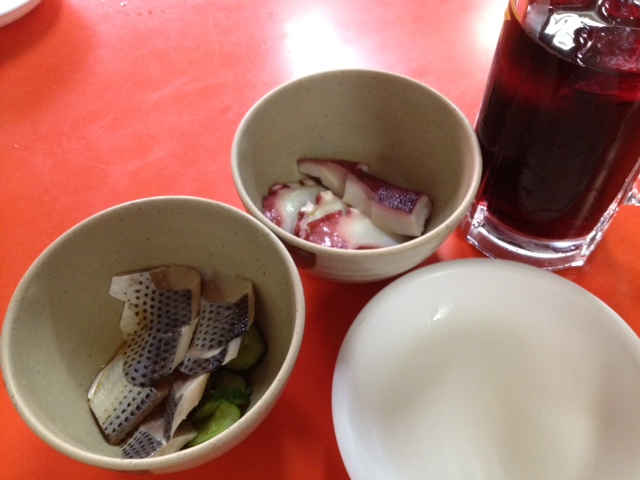 こはだ酢とタコ酢。酸味もまろやかで食べやすいです。右に映ってるのはかち割赤ワイン。氷で薄まっちゃって超軽いww。そして魚と一緒だが気にしない!(笑)