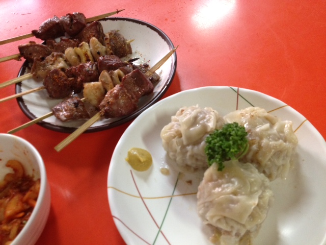 手作りシューマイ(激うま!)と焼き鳥(タン、ハツ、ナンコツ)の塩。シューマイはお酢たっぷりめのお醤油で頂くのが好き!