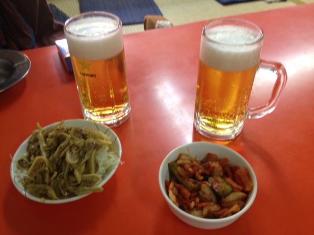 とりあえず生ビールとキムチと中華ガツ(ミノのからし和え)!